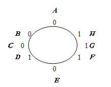 比如,从A位置开始,逆时针方向取三个数000,然后再从B位置上开始取三个数001,接着从C开始取三个数010,...可以得到000,001,010,101,011,111,110,100共8个二进制数且都不相同。