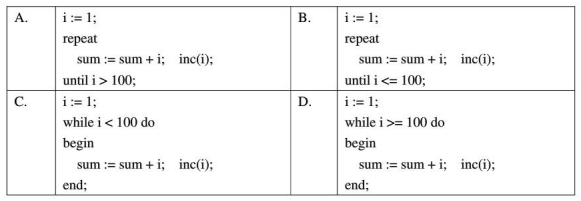 19. 下列程序中,正确计算 1, 2, ..., 100 这 100 个自然数之和 sum (初始值为 0) 的是( ) 。