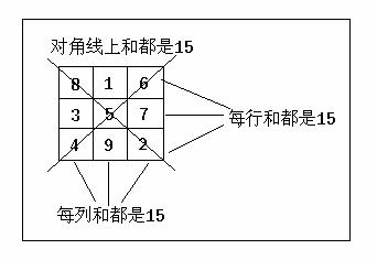 把1至n*n的正整数填在n行n列的正方形图内,使每一行、每一列和二条对角线上n个数之和都相等。这样的方阵图叫做幻方。如右图所示是一个3行3列的幻方。