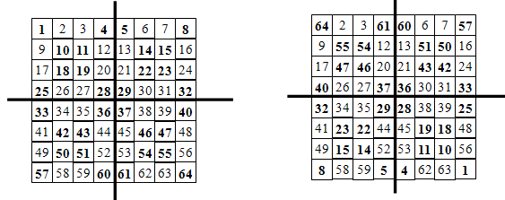 法2.如果n=4k,如下图所示,先将1~n*n的数按行优先的次序填入表格中。然后将表格分为k*k个小表格,每个小表格有4行4列。将每个小表格中二条对角线上的8个数以n*n+1去减,即如果原来位置上的数为x,则替换为n*n+1-x。