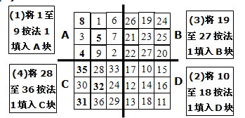 法3.如果n=4k+2,如下图所示,先将表格分成A、B、C、D四块,每块都是奇数行奇数列的,根据填入奇数幻方的方法,按ADBC的次序填好。然后: