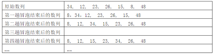 14. 下表是对原始数列“34, 12, 23, 26, 15, 8, 48”进行从小到大样序的过程(采用冒泡排序),按照下表信息以及冒泡排序算法的思想,则表中第三趟冒泡结束时的数列应为( )